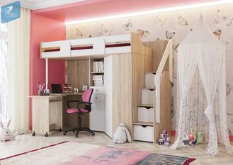 Кровать-чердак имеет в своем составе имеет кровать (расположена сверху), лестницу, шкаф угловой для одежды, шкаф комбинированный с двумя выдвижными ящиками, стол письменный с дополнительным поворотным столом.