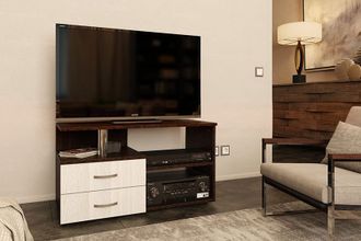 Тумба оснащена двумя выдвижными ящиками и двумя открытыми нишами для аппаратуры.