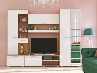 Описание: Модульная система «Флай» для гостиной – это современное решение для квартиры и дома. Благодаря лаконичному дизайну и приятному актуальному цветовому решению гостиная отлично впишется в любой интерьер. Сочетание оттенков натурального дерева с глянцевыми белыми фасадами – это тренд настоящего времени, который, несомненно, привлечет взгляды и вызовет интерес Ваших гостей. Зеркальные плитки с фацетом на створке шкафа наполнят пространство легкой игрой света, подарив тем самым отличное настроение.