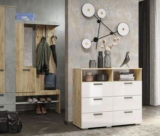 Описание: Комод имеет выдвижные элементы на шариковых направляющих для одежды, белья или аксессуаров. Верхняя поверхность имеет открытую нишу над корпусом, которая удобна для хранения нужных под рукой предметов. А на самой верхней полке можно поставить дорогие сердцу фотографии или оригинальные аксессуары.