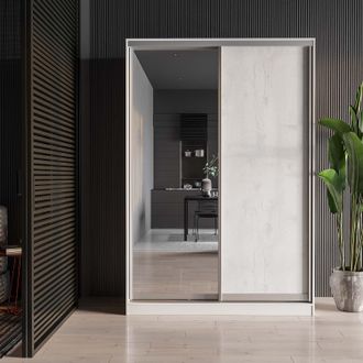 Описание: Шкаф-купе «Мадрид» представляет собой сочетание практичности и функциональности. Одна из створок полностью декорирована зеркалом с еврокромкой. Внутри с одной стороны находятся пять просторных полок для хранения вещей и постельного белья, с другой стороны – вместительная зона хранения с горизонтальной хромированной штангой для одежды на вешалках.